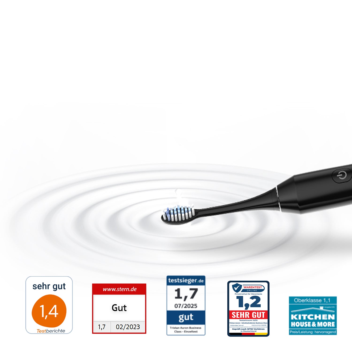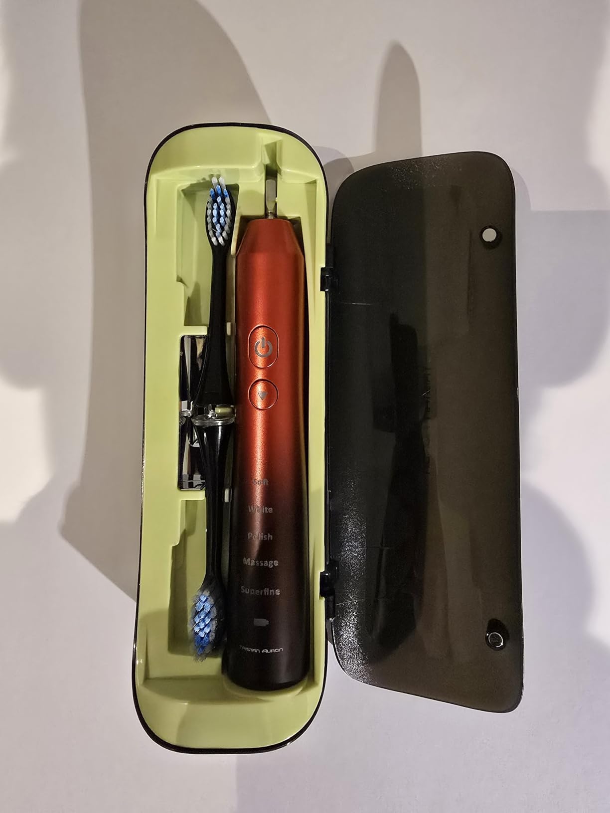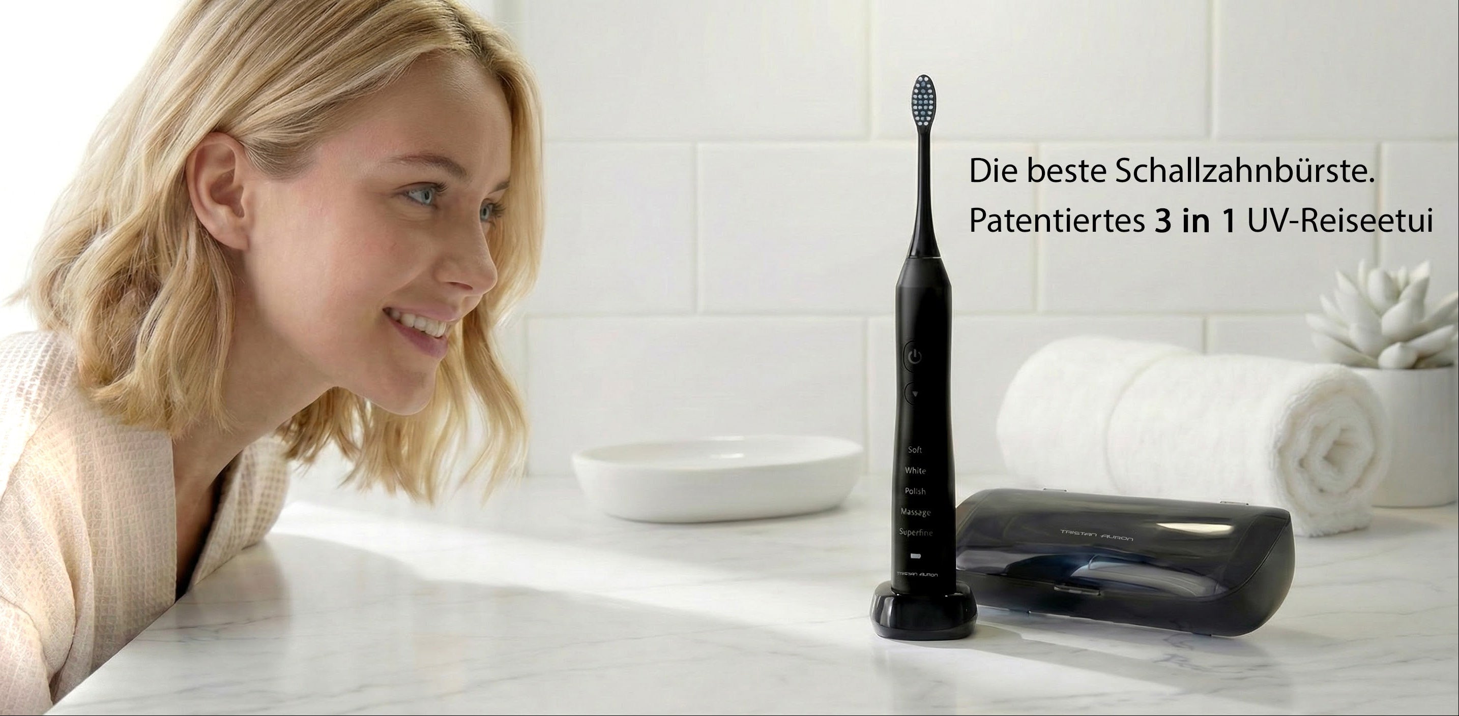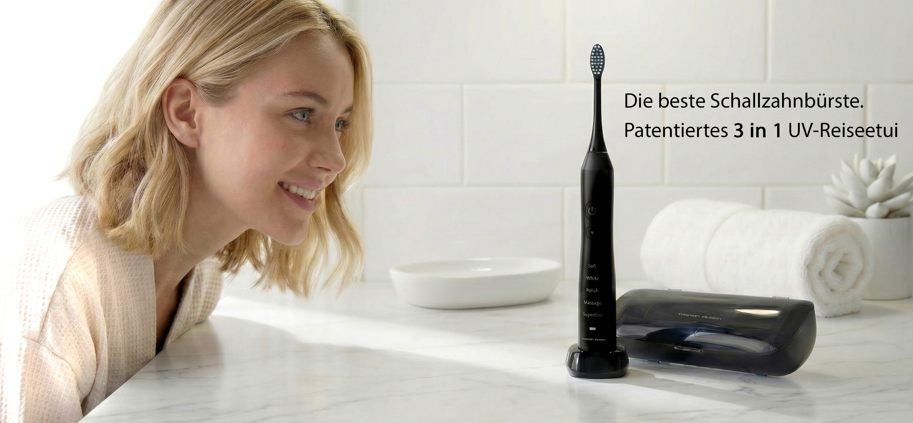 Die langlebige Batterie, das wasserdichte Gehäuse, präzise Bürstenköpfe und die perfekte Kombination mit der Munddusche und dem UV-Case machen Tristan Auron zur vollständigen Zahnpflegelösung für Zuhause und unterwegs.