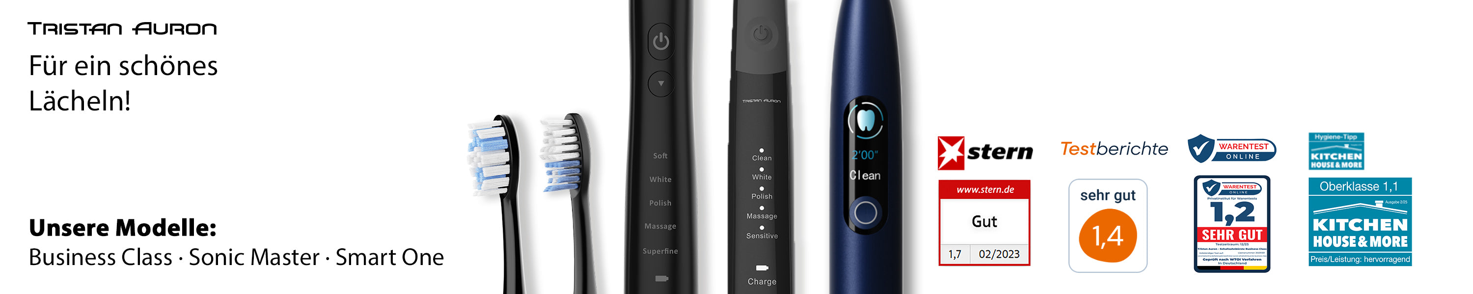 Die Schallzahnbürsten von Tristan Auron vereinen innovative Technik, modernes Design und starke Leistung – für ein strahlendes Lächeln und gesunde Zähne. Mit bis zu 55.000 Vibrationen pro Minute, langer Akkulaufzeit und mehreren Reinigungsmodi machen unsere Modelle Business Class, Sonic Master und SmartOne Deine tägliche Zahnpflege effizienter und angenehmer. Willkommen in der modernen Welt der Mundhygiene.