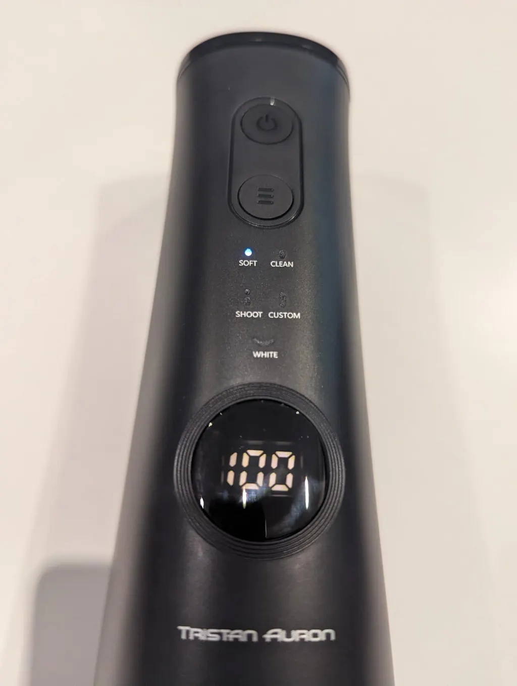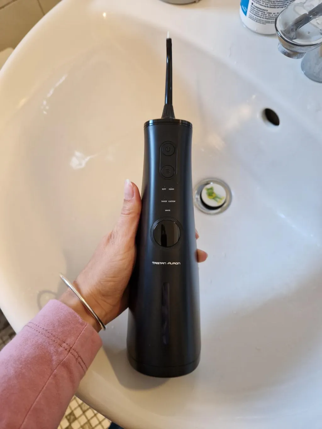 Die Munddusche von Tristan Auron entfernt zuverlässig Speisereste und Plaque aus schwer zugänglichen Zahnzwischenräumen. Der gezielte Wasserstrahl ist sanft, aber effektiv – perfekt für die tägliche Zahnpflege.